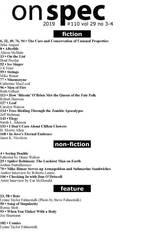 I am very late to this, but I see Issue #110 Vol. 29 No.3-4 of On Spec came out in April with a piece by me – well, really a collection of very short pieces called ‘The Care and Conservation of Unusual Properties’.